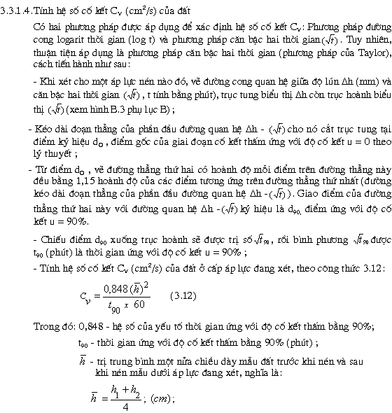 3.1.4.3. Thí nghiệm được tiến hành với từng cấp áp lực nén theo thứ tự từ nhỏ đến lớn. Mỗi cấp áp lực nén tác dụng lên mẫu được giữ nguyên trong 24 giờ, thời gian để các loại đất bình thường đạt tới lún ổn định của giai đoạn cố kết thấm. Đối với đất sét mềm nhão, sau 24 giờ có thể vẫn còn biến dạng lún đáng kể, được quy định lấy lượng lún sau mỗi giờ tiếp theo không vượt quá 0.005mm làm tiêu chuẩn ổn định lún.