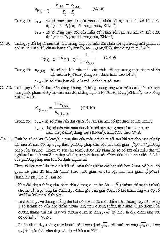 C.4.8. Tính quy đổi hệ số nén tương ứng của mẫu đất chứa sỏi sạn trong một phạm vi áp lực nén nào đó, chẳng hạn từ P1 đến P2, aV (1-2) (m2/KN), theo công thức C.4.8: