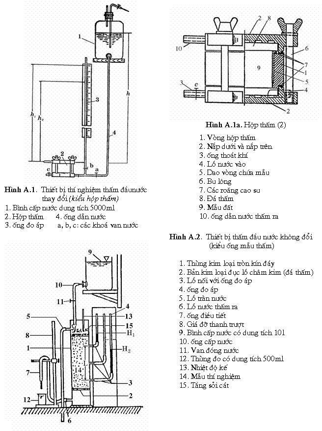 3.2.1. Thiết bị thí nghiệm thấm đầu nước thay đổi, kiểu hợp thấm, có kết cấu được mô tả tổng quát ở hình A.1 phụ lục A. Các chi tiết của hộp thấm có kích thước đảm bảo phù hợp với dao vòng chứa mẫu được lắp đặt vào hộp;
