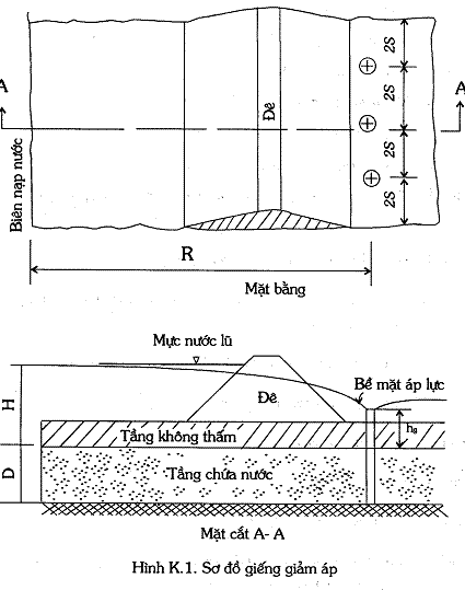 1.4.1. Hệ thống giếng giảm áp là hệ thống giếng khoan có kết cấu ống lọc đư­ợc lắp đặt ở chân đê phía đồng để làm giảm áp lực thấm ở nền bằng cách cho thoát nước theo hình thức tự chảy về mùa lũ, kiểm soát quá trình thấm và ngăn ngừa xói ngầm, cát chảy làm mất ổn định nền đê. Nước thoát ra từ hệ thống giếng đ­ược dẫn theo hệ thống ống dẫn kết hợp tiêu thoát chân đê chảy vào các ao hồ nội đồng. Sau đây, thuật ngữ giếng giảm áp hiểu là bao gồm cả hệ thống giếng, hệ thống ống dẫn kết hợp tiêu thoát chân đê, hệ thống ống thu n­ước, hệ thống ống tiêu nư­ớc vào các ao hồ nội đồng.