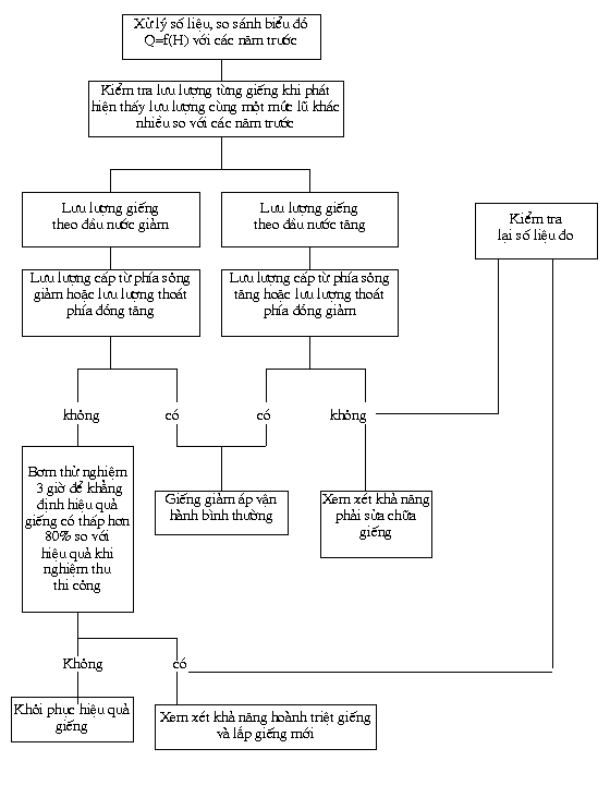 6.11. Từ các kết quả quan trắc lưu lượng thoát trong mùa lũ, kết quả bơm kiểm tra định kỳ, bơm kiểm tra 3 giờ, kết quả quay videocamera, sau khi qua xử lý đã chỉ ra được giếng bị suy thoái, căn cứ vào nguyên nhân gây bít tắc thực hiện các phương án xử thích hợp Những giếng sau khi đã xử lý mà hiệu quả vẫn bị suy giảm trên 80% so với hiệu quả khi nghiệm thu thi công thì phải bị hoành triệt và lắp đặt giếng mới ở bên cạnh.