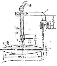 Trên hình 2 trình bày bộ phận điều chỉnh mực nước tự động, kết cấu của E.V. Ximônốp. Trên phao rỗng 1 gắn một van hình nón đồng tâm 2 để đóng kín lỗ dưới của ống cứng tiếp nước 3. |