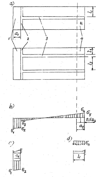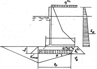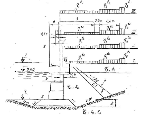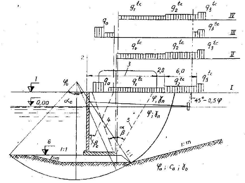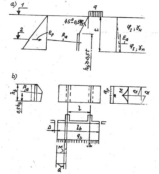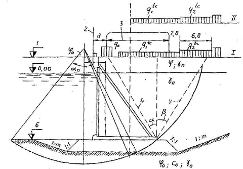 a – sơ đồ chịu lực của lăng thể; b – biểu đồ áp lực bị động; 1 – cao trình đáy bến; 2 – cọc ván