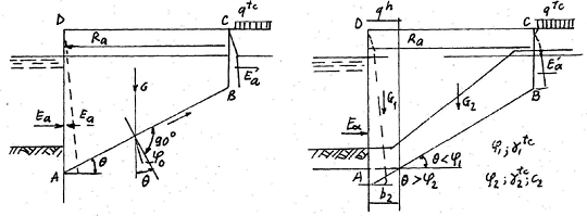 4 – Từ phía tường mặt, trên chiều cao AD, khối đất ABCD chịu tác động của áp lực chủ động Eo của đất; từ phía kết cấu neo – áp lực chủ động E’a; theo mặt trượt AB – phản lực của đất Q = tác động theo hướng góc nghiêng so với đường vuông góc và lực dính Co.