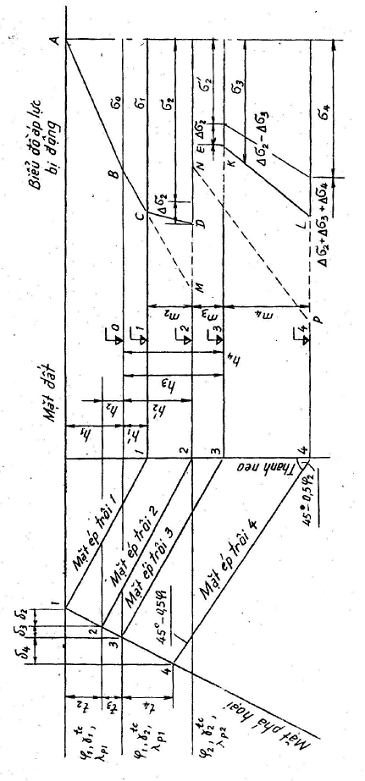 4. Biểu đồ tổng của áp lực bị động – ABCDEKL. Còn biểu đồ áp lực bị động khi đảm bảo đủ khoảng cách giữa tường mặt và tường neo là ABMNP (xem hình và các điều 13.32, 20.4 và 20.24).