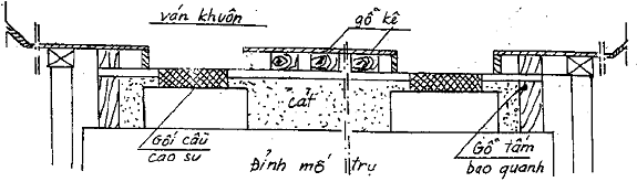 5) Đặt tấm thép đệm trên mặt cát, tấm đệm được cắt rộng ra xung quanh gối cầu. Phải đặc biệt chú ý làm kín nước cho ván khuôn, bởi vì nếu nước bị tích tụ trước lúc đổ bê tông ở mặt trên là gây nguy hại, nếu để nước hoặc vữa chảy ra ngoài sẽ gây khó khăn cho việc gạt bỏ cát lúc tháo dỡ khuôn.