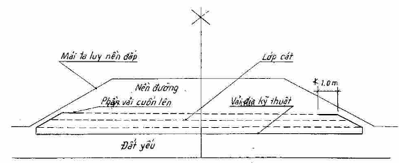 1.2. Vải địa kỹ thuật được đặt giữa nền đất yếu và nền đắp làm chức năng tăng cường ổn định cho nền đắp đồng thời tạo hiệu ứng de để đầm chặt đất đắp.