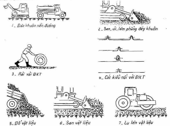 Các bước công nghệ thi công công trình ứng dụng vải ĐKT xây dựng nền đường trên đất yếu thực hiện ở hình 4.