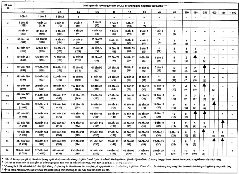 9.2. Bảng phương án ly mẫu một lần chấp nhận được của nhà cung ứng