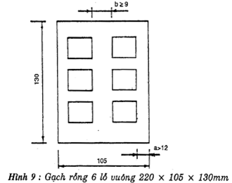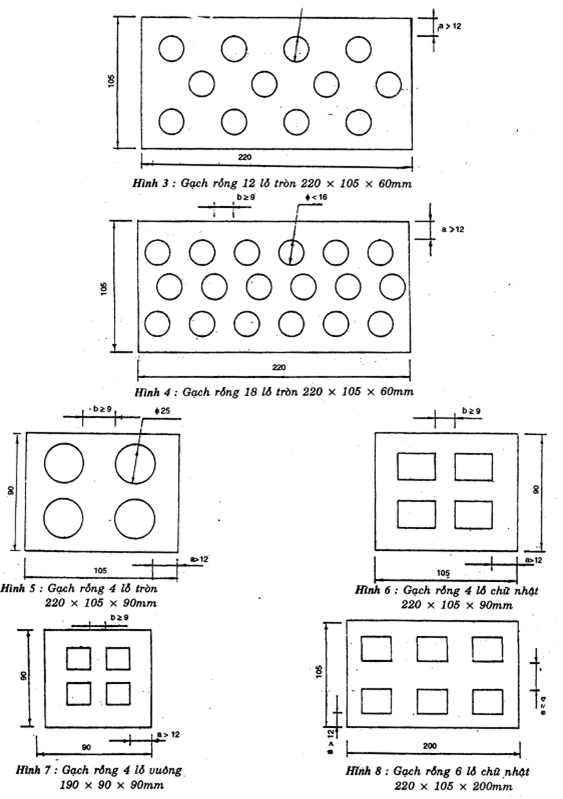 Chú thích: Cho phép sản xuất gạch rỗng cỡ lớn và gạch rỗng với số lượng, kích thước và cách bố trí lỗ rỗng khác với các hình vẽ từ 1 đến 9 nhưng phải đảm bảo yêu cầu nêu ở điều 2.4, 2.5 và 2.6.
