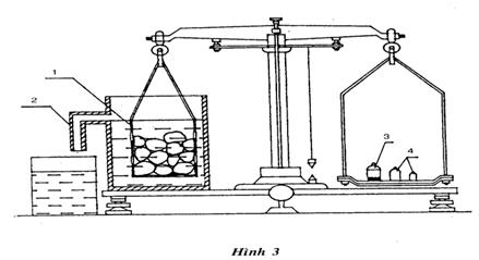 3.4. Cân thủy tĩnh mẫu thử bằng cách thay đĩa cân trái của cân kĩ thuật bằng một lưới đồng thưa để đặt mẫu thử, trên treo một đĩa cân nhỏ. Lưới đồng nhúng ngập trong cốc nước có ống chảy tràn để giữ mức nước cố định (hình 3).