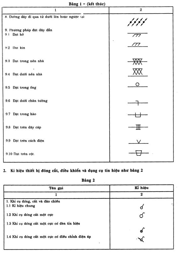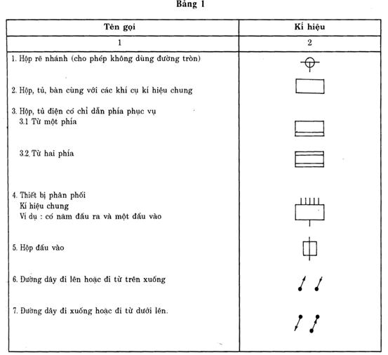 1. Kí hiệu các thiết bị rẽ nhánh, thiết bị nối, chỉ dẫn chiều và phưng pháp đặt dây dẫn phi phù hợp với bng 1.