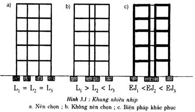 – Khi thiết kế nhà cao tầng có kết cấu chịu lực là hệ khung BTCT toàn khối nên chọn các khung đối xứng và có độ siêu tĩnh cao. Nếu là khung nhiều nhịp thì các nhịp khung nên chọn bằng nhau hoặc gần bằng nhau (hình 3.1 a). Không nên thiết kế khung có nhịp quá khác nhau (hình 3.1 b). Nếu phải thiết kế các nhịp khác nhau thì nên chọn độ cứng giữa các nhịp của dầm tương ứng với khẩu độ của chúng (hình 3.1 c).
