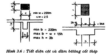 – Chiều rộng tối thiểu của tiết diện dầm không chọn nhỏ hơn 220 mm và tối đa không lớn hơn chiều rộng cột cộng với 1,5 lần chiều cao tiết diện (hình 3.6). Chiều cao tối thiểu của tiết diện không nhỏ hơn 300 mm. Tỉ số giữa chiều cao và chiều rộng của tiết diện không lớn hơn 3.