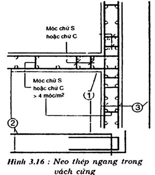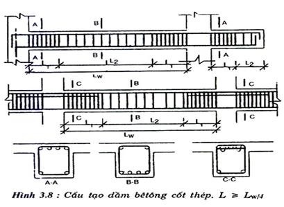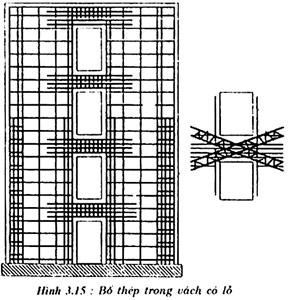 – Đối với các vách có lỗ khi thiết kế phải cấu tạo thêm thép ở khu vực biên của các cột, vách cũng như cho các dầm lanh tô của vách (hình 3.15).