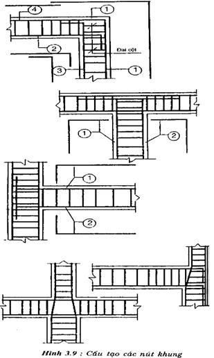 – Các nút khung, các nút liên kết giữa cột vách và dầm nối ở các vách cứng hay lõi cứng là những vị trí tập trụng nội lực lớn, nên ngoài việc bố trí các cốt thép chịu lực theo tính toán, cần đặt thêm cốt đai gia cường. Các cốt đai này phải đảm bảo sự liên kết của cột và dầm chống lại sự gia tăng lực cắt một cách đột ngột tại nút và tăng cường sự bền vững của nút chống lại những nội lực xuất hiện trong tiết diện nghiêng mà trong tính toán thiết kế chưa định lượng được. Trên hình 3.9 thể hiện một số nguyên tắc cơ bản cấu tạo các nút ở vị trí khác nhau của khung.