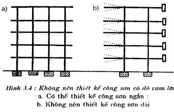 – Nên tránh thiết kế công sơn (kể cả công sơn dầm và công sơn bản sàn). Trong trường hợp cần có công sơn phải hạn chế độ vươn của công sơn đến mức tối thiểu và phải tính toán kiểm tra với tải trọng động đất theo phương thẳng đứng (hình 3.4).