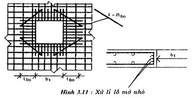 – Trong trường hợp vách có lỗ mở nhỏ (b1 và e £ 500mm – xem hình 3.11), phải đặt tăng cường ít nhất ở mỗi biên và mỗi góc lỗ mở.