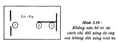 – Nên thiết kê các vách giống nhau (về độ cứng cũng như kích thước hình học) và bố trí sao cho tâm cứng của hệ trùng với tâm khối lượng của nó. Trong trường hợp chỉ đối xứng về độ cứng (độ cứng trong giai đoạn đàn hồi) mà không đối xứng về kích thước hình học (hình 3.10) thì khi vật liệu làm việc ở giai đoạn dẻo dưới tác động lớn như động đất vẫn có thể dẫn đến sự thay đổi độ cứng. Điều này sẽ gây ra biến dạng và chuyển vị khác nhau trong các vách khác nhau. Hệ quả là sự đối xứng về độ cứng bị phá vỡ và phát sinh ra các tác động xoắn rất nguy hiểm đối với công trình.