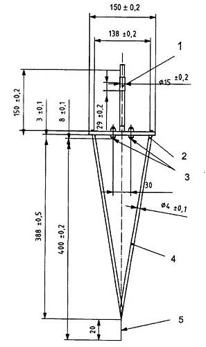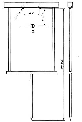 4.1.3. Con lắc Persoz (xem Hình 2) đặt trên hai viên bi vonfram cacbua có đường kính (8 ± 0,005) mm, độ cứng (1 600 ± 32) HV 30 1), khoảng cách hai viên bi là (50 ± 1) mm. Không có đối trọng. Trên tấm kính phẳng mài bóng, chu kỳ dao động phải là (1 ± 0,01) s và thời gian dao động tắt dần của con lắc từ góc 12° đến góc 4° trên cùng một nền là (430 ± 15) s. Tổng khối lượng của con lắc là (500 ± 0,1) g và trọng tâm của con lắc tại điểm tĩnh thấp hơn mặt phẳng điểm tựa là (60 ± 0,1) mm, đầu nhọn của con lắc thấp hơn mặt phẳng điểm tựa là (400 ± 0,2) mm.