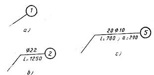 Trên các đoạn uốn của thanh cốt thép, cho phép không vẽ đường dóng và đường ghi kích thước (hình 5c). Kích thước ghi trên mỗi đoạn cốt thép chỉ là kích thước phần thẳng của nó mà không kể chiều dài của móc neo ở đầu thanh (nếu có móc đó). Đoạn dài của móc vuông cần được ghi rõ. Đối với cốt đường kính lớn (Æ ³ 22 mm) cần ghi kích thước của móc neo. Kích thước toàn bộ của thanh thép (kể cả móc neo) được ghi trong bảng kê vật liệu.