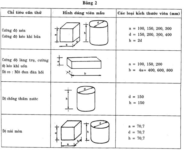 các mẫu hoặc có kích thước hình học chính xác theo quy định ở bảng l và bảng 2, hoặc các viên có hình dáng bất kỳ với điều kiện thể tích của một viên không nhỏ hơn thể tích của viên mẫu lập phương tương ứng có kích thước cạnh đảm bảo quy