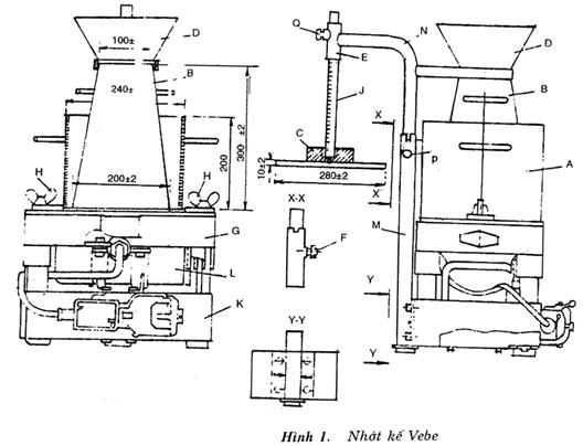 1.1. Nhớt kế Vebe được làm bằng thép gồm một thùng hình trụ đáy kín (A) , bên trong đặt một côn tạo hình hỗn hợp bê tông (B) , và một phễu đổ hỗn hợp (D). Trên thùng có một đĩa mica phẳng (C). Đĩa này có thể trượt tự do theo phương thẳng đứng nhờ thanh trượt (J) gắn với một tay đỡ (N). Tay đỡ (N) trượt hoặc giữ cố định bằng vít hãm (F) trong ống (M) bắt cố định với đế bàn rung (K).