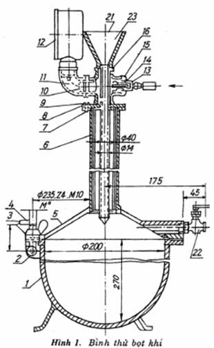 Bình thử bọt khí (hình 1) là một bình kim loại hình trụ, đường kính bằng 0,75 ± 1,25 chiều cao, nắp hình côn. Nắp được liên kết với thân bình bằng gioăng cao su và bu lông hãm. Nắp bình được gắn van điều chỉnh nước và một ống trụ nhỏ trong có đặt một ống thuỷ tinh khắc độ. Đầu ống trụ có các nhánh để gắn áp kế, bơm, phễu và để đóng kín bình khi thử. Bình có dung tích tối thiểu 5 lít và phải được gia công đủ cứng để không bị biến dạng thể tích quá 0,l% giá trị hàm lượng bọt khí dưới tác dụng của áp lực thử.
