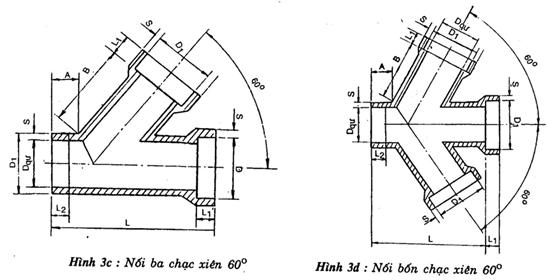 Ví dụ: Kí hiệu quy ước của mối nối bốn chạc xiên 60o với đường kính lỗ thông quy ước Dqư = 100mm như sau: nối bốn chạc xiên 60o.100 TCVN 3786: 1994 (hình 3d).