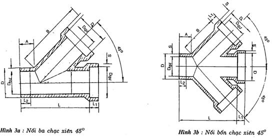 Ví dụ: Kí hiệu quy ước của mối nối bốn chạc xiên 450 với đường kính lỗ thông quy ước Dqư = 100mm như sau: nối bốn chạc 450.100 TCVN 3786: 1994 (hình 3b).