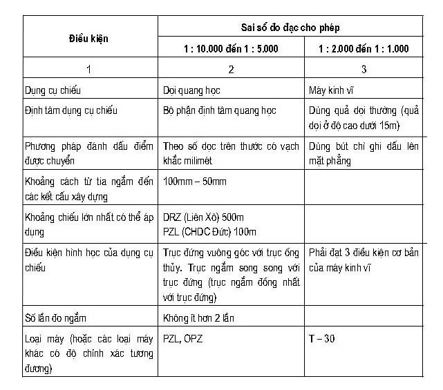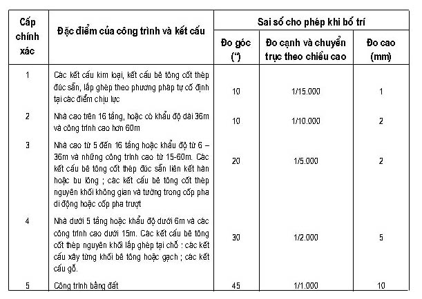 4.12. Sai số đo để kiểm tra độ chính xác không được quá 2/10 sai lệch cho phép đã nêu trong các quy phạm thi công và nghiệm thu công trình hoặc trong bản thiết kế.