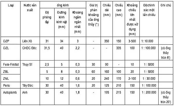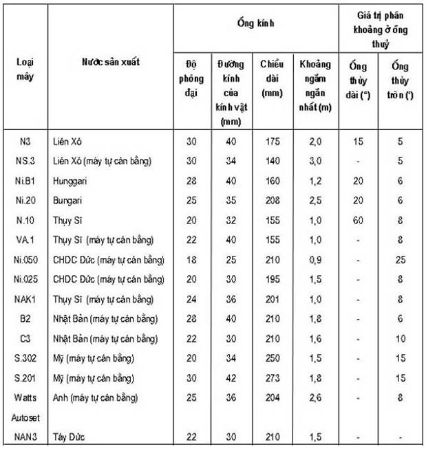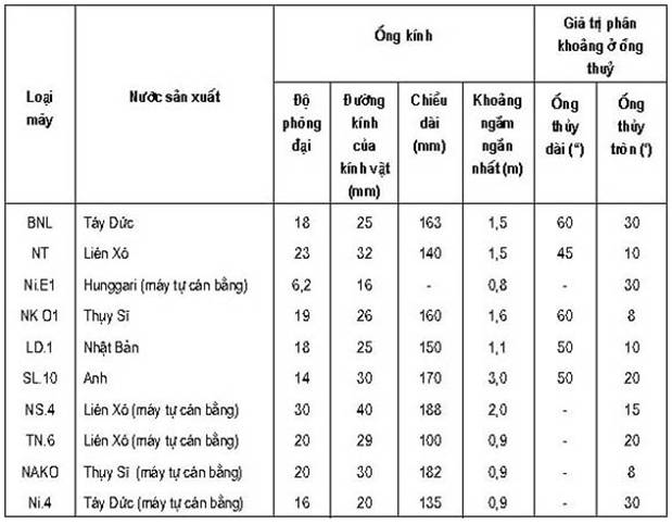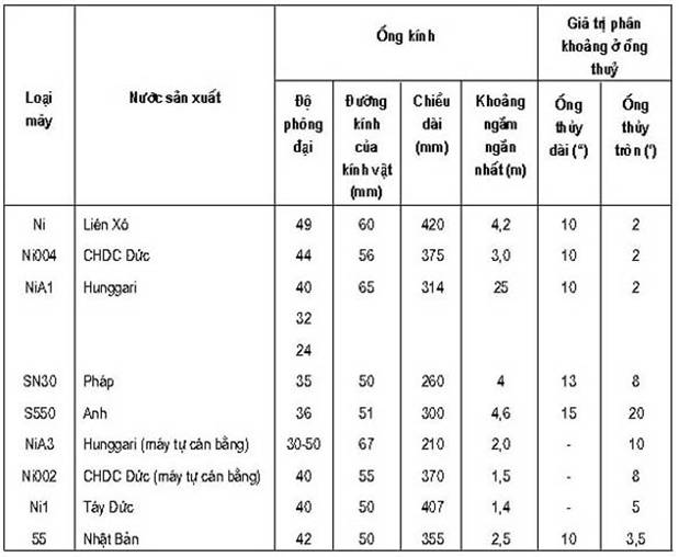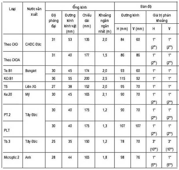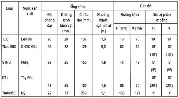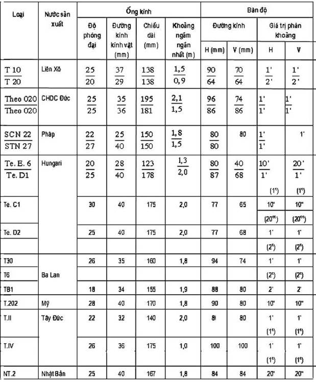 – Đường kính bàn độ ngang từ 100 -250mm, bàn độ đứng từ 90 -150mm. Thiết bị đọc số ở loại máy cũng được chế tạo theo phương pháp cơ học (răng cưa), ở loại máy mới là bộ đo cực phổ quang học. Độ phóng đại của ống kính từ 30 đến 65 lần và đường kính của kính vật khoảng 60mm.
