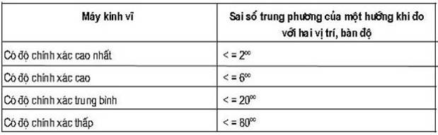 Căn cứ vào sai số trung phương có thể đạt được của một hướng, khi đo với hai vị trí bàn độ thì máy kinh vĩ được chia thành 4 loại như sau :