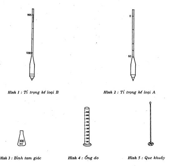 – Tỉ trọng kế có thang từ 0,995 đến 1,030 và có giá trị của mỗi vạch chia là 0,001(loại B) (hình 1) hoặc tỉ trọng kế có thang chia từ 0 đến 60 (loại A) (hình 2);