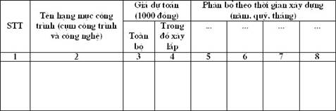 4) Từ cột 5 trở đi, nếu công trình thi công với thời hạn dưới một năm thì phân bố vốn đầu tư và vốn xây lắp theo quý hoặc tháng.
