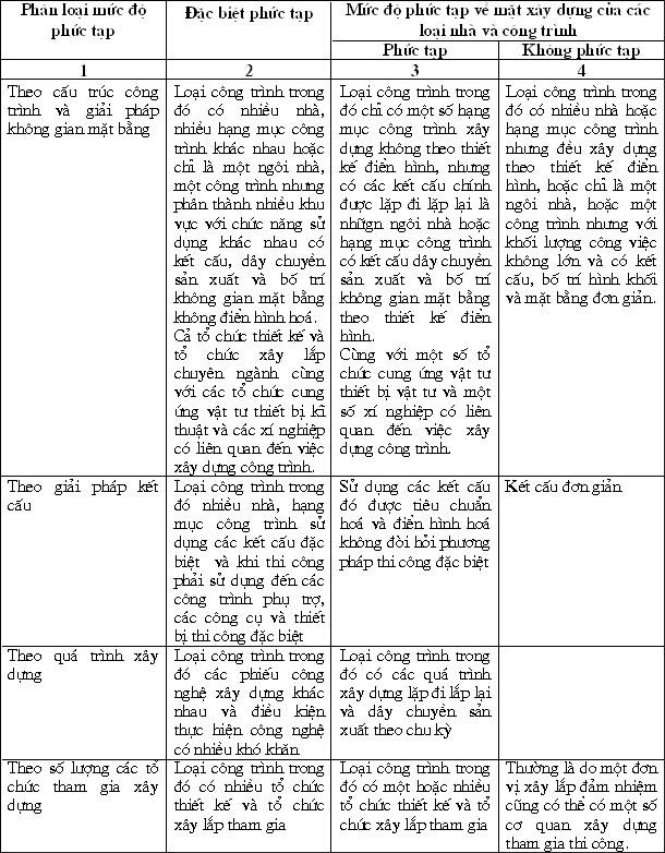 BẢNG PHÂN CÔNG MỨC ĐỘ PHỨC TẠP VỀ MẶT XÂY DỰNG CỦA CÁC LOẠI NHÀ VÀ CÔNG TRÌNH