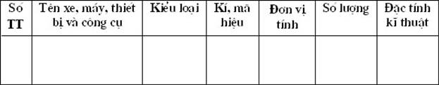 2.Biểu tổng hợp nhu cầu về xe, máy, thiết bị và công cụ (bảng 2)