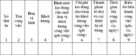 Cột (6) chỉ ghi khối lượng lao động để thực hiện từng thao tác phù hợp với biện pháp thi công được chọn