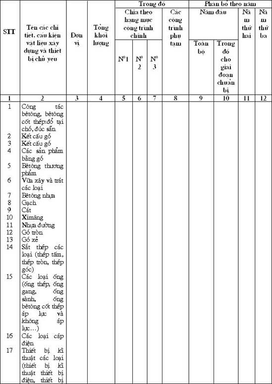 Biểu 3 – Biểu tổng hợp nhu cầu các chi tiết, cấu kiện vật liệu xây dựng và thiết bị chủ yếu