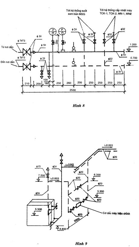 Sơ đồ trạm điều chỉnh hệ thống sưởi và cấp nhiệt (xem hình vẽ 8). Cần viết số thứ tự khi viết tên trạm điều chỉnh (thí dụ trạm điều chỉnh – 1). Sơ đồ những cụm sưởi và cấp nhiệt (cụm sấy không khí, cụm làm lạnh không khí…) xem hình vẽ 9.
