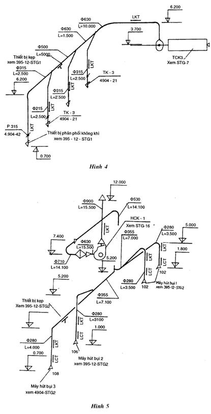 Cách trình bày sơ đồ hệ thống thông gió xem hình vẽ 4 và 5.