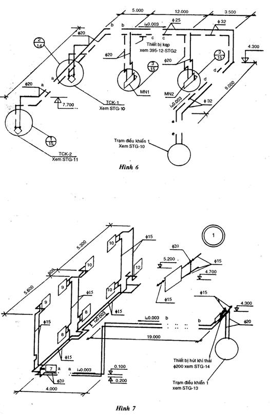 Cách trình bày sơ đồ hệ thống sưởi xem hình vẽ 6 và 7.