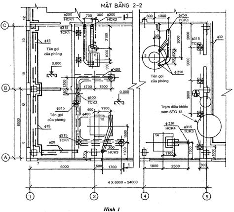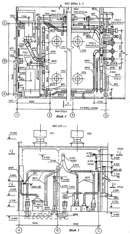 Cách trình bày mặt bằng hệ thống sưởi và thông gió xem hình vẽ 1 và 2, mặt cắt xem hình vẽ 3;