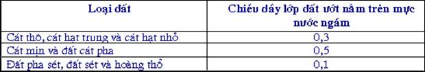 2.20. Khi thi công đất, ngoài lớp đất nằm dưới mức nước ngầm bị bão hoà nước, còn phải chú ý đến mức lớp đất ướt trên mức nước ngầm do hiện tượng mao dẫn. Chiều dầy lớp đất ướt phía trên mực nước ngầm cho trong bảng1.
