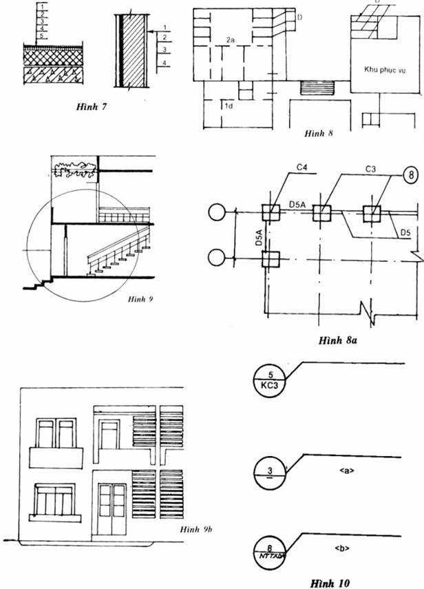 Trường hợp cần vẽ chi tiết một đoạn mặt đứng, đoạn mặt cắt hay đoạn mặt bằng cho phép dùng dấu móc đơn để giới hạn phần cần vẽ chi tiết (hình 9b) thay cho kí hiệu đường tròn nét liền mảnh. Phía dưới dấu móc -ghi kí hiệu của bản vẽ chi tiết.