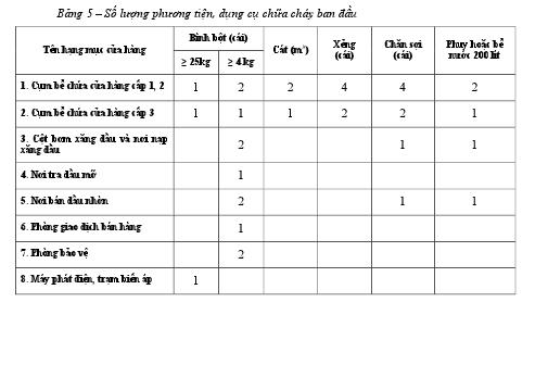 Bảng 5: Số lượng phương tiện, dụng cụ chữa cháy ban đầu