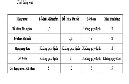 Bảng 3: Khoảng cách an toàn từ cột bơm và cụm bể tới ranh giới của công trình ngoài khu vực cửa hàng