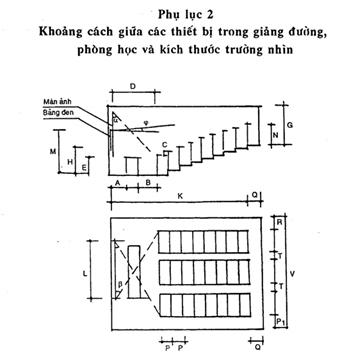 Chiều rộng phòng học Góc đứng tạo bởi tia nhìn của người ngồi hảng ghế đầu tới mép trên màn ảnh theo phương thẳng đứng Góc nghiêng của tia quang học máy chiếu tới chính giữa màn ảnh: – Đối với mặt phẳng ngang – Với mặt phẳng thẳng đứng + Hướng lên trên + Hướng xuống dưới Góc ngang hợp bởi tia nhìn tới mép thẳng đứng xa nhất của bảng với đường băng trên mặt bảng ngang tắm mắt của học sinh ở hàng ghế đầu cho ngoài và trong cùng |