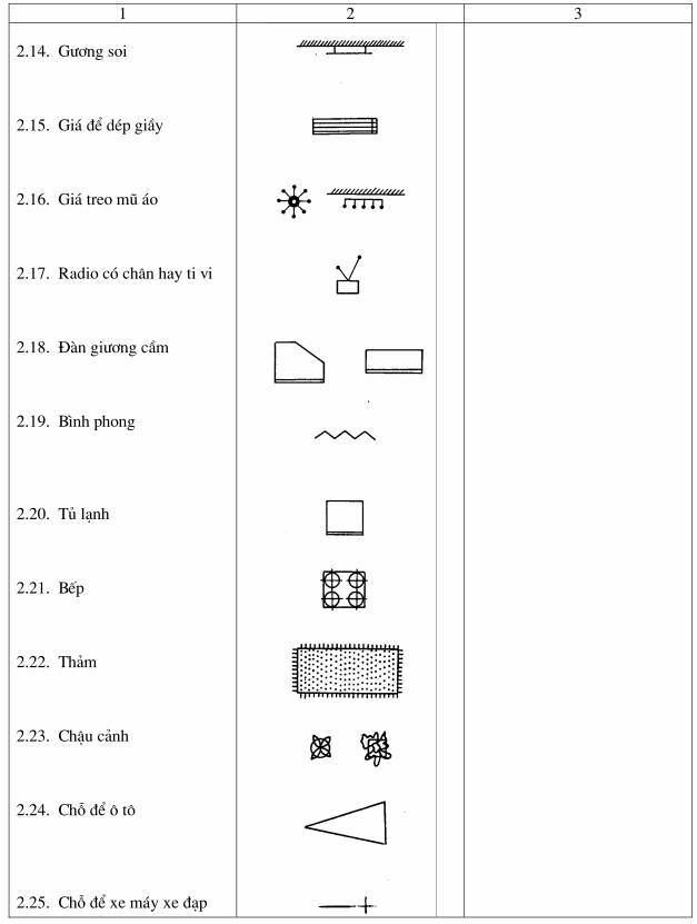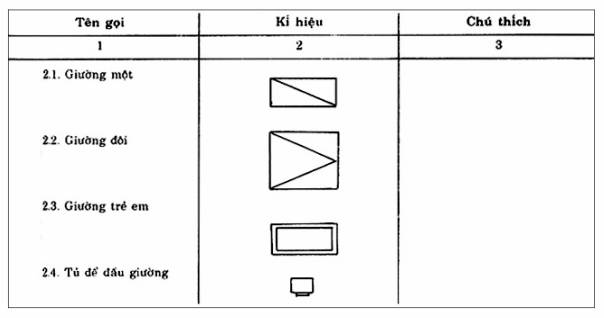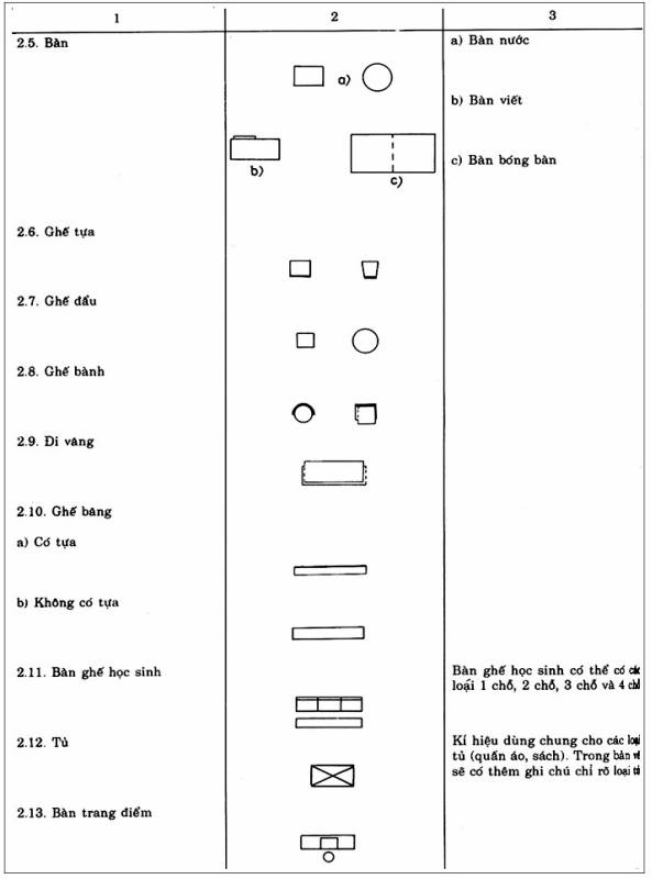 1.1. Tiêu chuẩn này quy định kí hiệu các đồ dùng trong nhà để thể hiện trên bản vẽ mặt bằng ngôi nhà với tỉ lệ 1 : 200 đến 1 : 100 trong thiết kế mới cũng như thiết kế cải tạo.