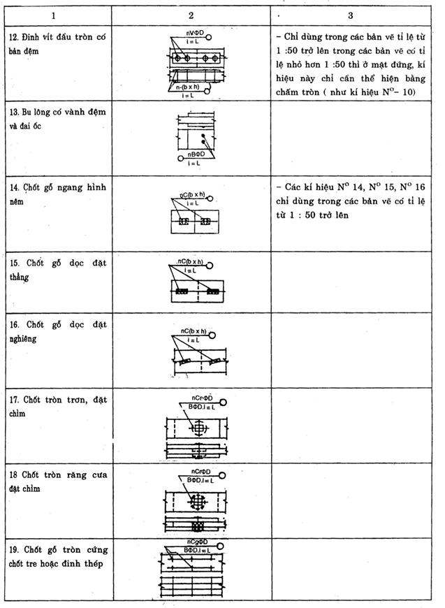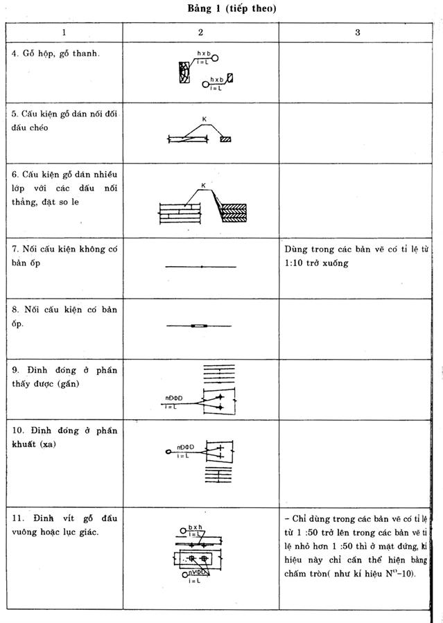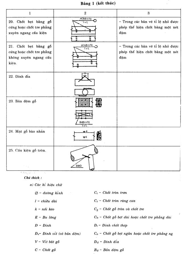 1.3. Những ký hiệu quy ước chung về vật liệu gỗ và dạng liên kết trong kết cấu gỗ được trình bày trong bảng, nếu sử dụng những kí hiệu không có trong bảng này thì phải chú thích trên bản vẽ.